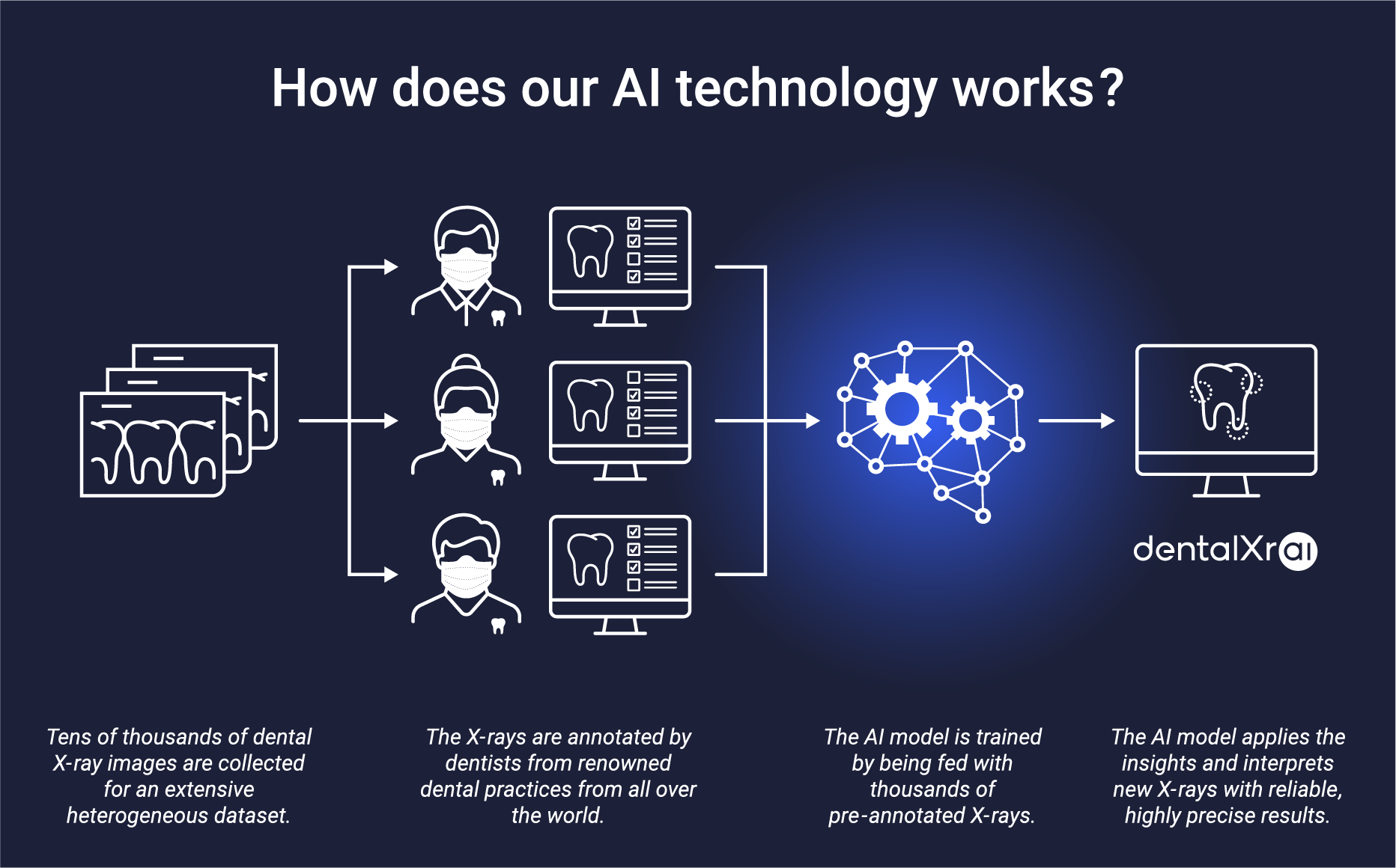 To develop dentalXrai, the team fed annotations from tens of thousands of X-ray images into the artificial neural networks to train the AI. The resulting algorithms detect, localize and classify various dental abnormalities and other findings.